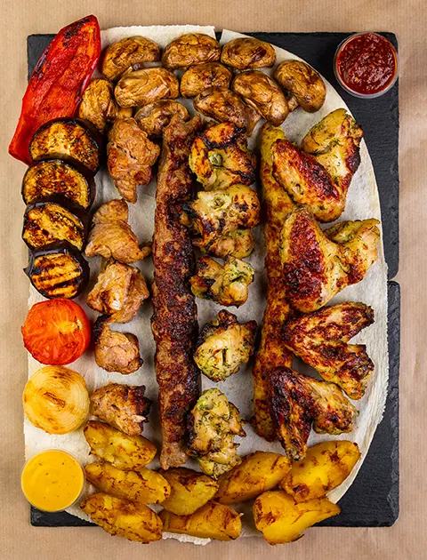 A selection of grilled chicken and lamb pieces cooked in the tandoor, offering variety, smoky aroma, and generous portions for Indian takeaway in Derby shared meals and group orders.